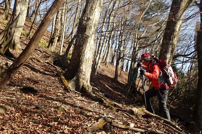 岩上谷林道を約25分歩いた所から作業道に入る | 自然林登り 作業道の峠を少し通り過ぎるとU字谷が現れるが、わざと少しルートを外して、右手の「南深山」直下の自然林登りを楽しむ。 ![]() |