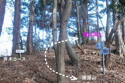 深山直下の分岐標識 ![]() 左:斉木からの正規ルート 左:深山頂上 |