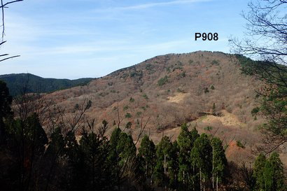 小野ルートの登山口からしばらくはネット境界沿いの急坂を登っていく。 振り向くと先ほど通過したP908mの稜線が見えていた。 | |