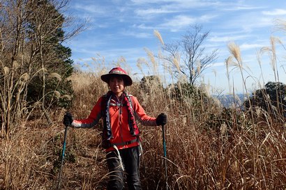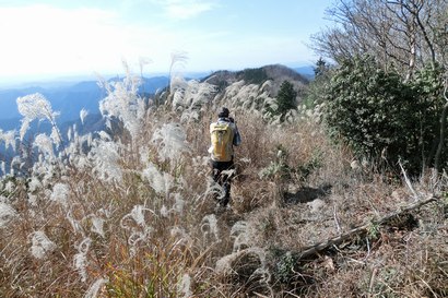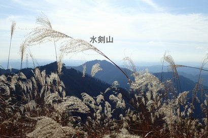 すすきが美しい稜線を林道登山口方面へ下る | すすきの穂先越しに見える水剣山(宍粟50名山) | |