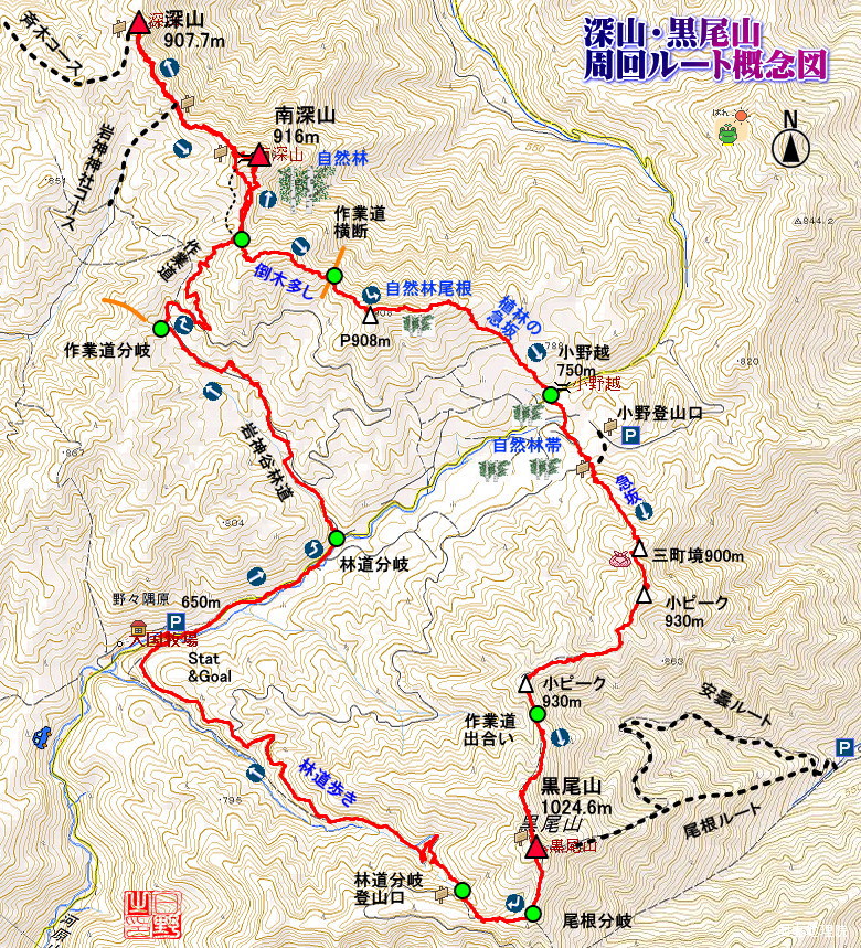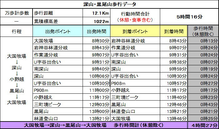 コース:大国牧場・・岩上谷林道・・作業道・・U字谷・・南深山・・深山・・南深山・・P908・・小野越・・黒尾山小野登山口・・黒尾山・・林道登山口・・大国牧場