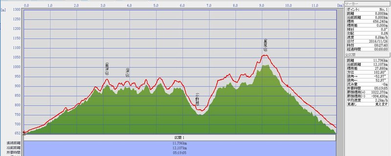 今回歩いたGPSログ軌跡です。 歩行距離:12.1Km 累積標高差:+1022m(誤差含む) |