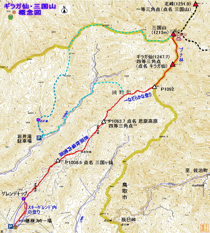 | ギラガ仙・恩原三国山ルート3D図(カシミールで作成) | ||
