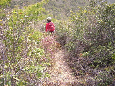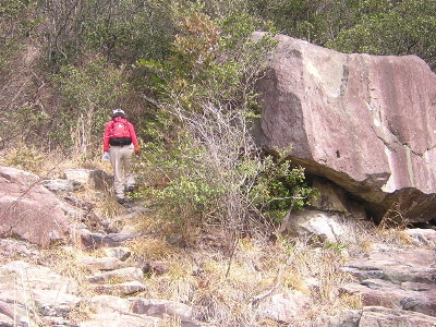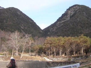 いよいよこれから山道に入っていく。 二つの山に挟まれたところが沢となっており、この沢沿いに登山道が付けられています。 右側の山肌は、露出した岩壁となっておりなかなか見応えがある。 |