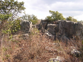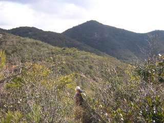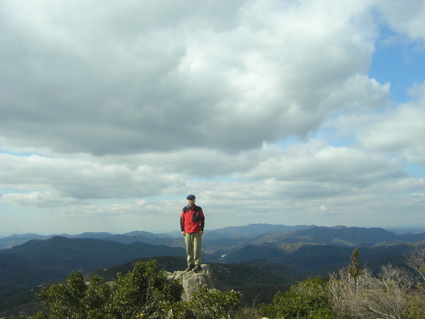 頂上の西側にある高さ2m程度の露岩に立った所を東側の頂上露岩から写真を写してもらいました。なかなか良い構図の写真で気に入っています | |