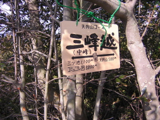 天狗山への稜線には3つのピークがあり、最初のピークを越えると本日始めて天狗山を見ることができた。なかなか綺麗な姿をした山です。この辺りの稜線は低木しか生えておらず、周囲の景色を見渡す事ができます | 稜線を進み、3つ目のピークには三峰越えの道標が掲げられている。 |