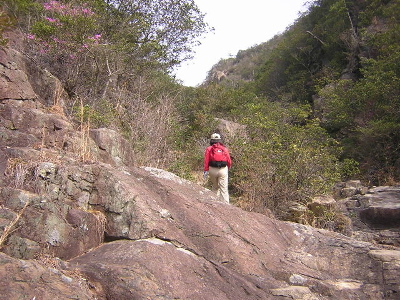 沢筋に入って行くと、予想もしなかった渓谷となっており沢登りの感触を味合わせてくれます。滑りやすい露岩には自然を損なわない程度にセメントで足場が作ってあり、ありがたく利用させて貰う。 | |