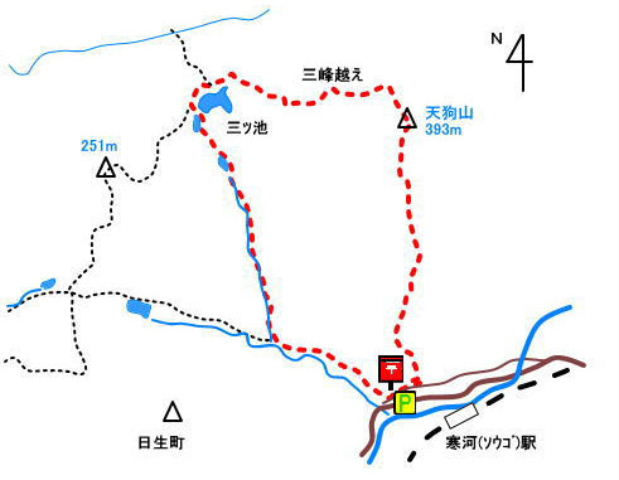 駐車場・・・Bコース入口・・・沢・・・最初の池・・・三ツ池分岐・・・三峰越え・・・天狗山(昼食)・・・神社・・駐車場