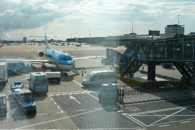 | アムステルダムのスキポール空港に到着しました。 いよいよトランジット(乗り継ぎ)です。日本からの便はFゲートに到着します。 Fゲートはスキポール空港の一方の端の方に有ります。シェンゲン協定国(協定国内へは国内移動と同じ扱いになります。よって協定国のスイスに行くのですが、最初に到着したシェンゲン協定国が入国した国になり、最後に出国した国が出国になるので、私たちは入国も出国もオランダになってしまいました。)への出発ゲートは反対方向へ相当歩いて行くGゲートへ向かわなければなりません。まずはFゲートを出ると左折して延々と歩いたり、動く歩道に乗って(途中にはショップが多く有ります)いきます。程なく、シェンゲン協定国への入国審査場所があり、さらに乗り継ぎ前の手荷物検査場が有ります。ここを抜けると、後は出発ゲート迄さらに歩かされますが、出発ゲートを確認した後はショップが周りにたくさん有るので、出発時間まで退屈せずにすみました。 乗り継ぎ方法に不安が有ったのですが、スキポール空港は非常に広いが構造が割と単純で、1フロアー内の移動だけなので乗り継ぎも思ったより簡単でした。 不安に思っていた課題の一つ、乗り継ぎ問題をクリア出来ました。 |