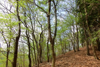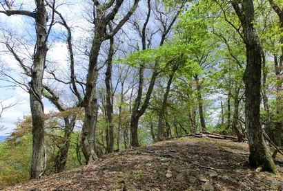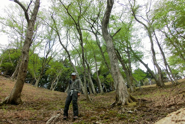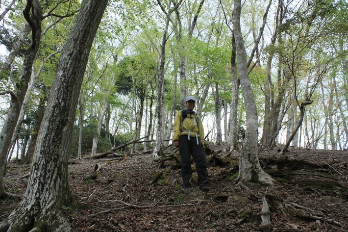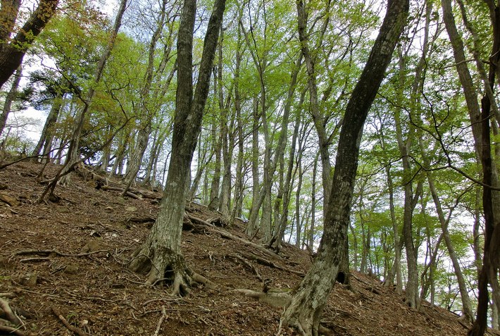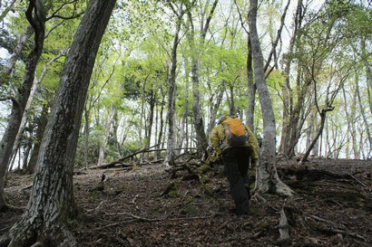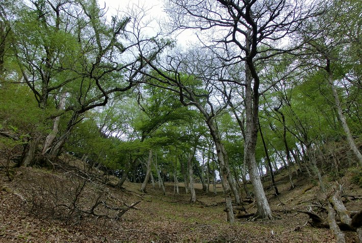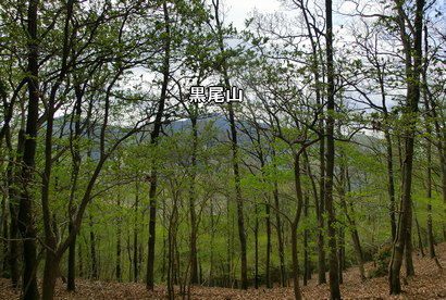 小野越から植林帯の尾根を登ってくると、やっと自然林の尾根に到達。 新緑の向こうに黒尾山が垣間見える。 | |