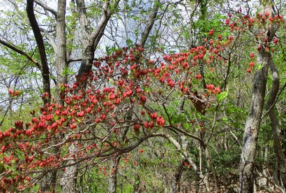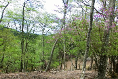 なだらかな尾根は南側は自然林、北側は植林です。 | ベニドウタンかと?近づいてみるとヤマツツジでした。 | |