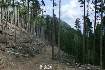 P908mから支尾根を辿るが、ルートには間伐材の倒木が多く非常に歩きにくい。 尾根を辿ってから2本目の作業道に降り立つ。 | 2本目の作業道をを180mほど北側に辿り、U字谷が現れた所から南深山に向かって綺麗な自然林を直登する。 | |