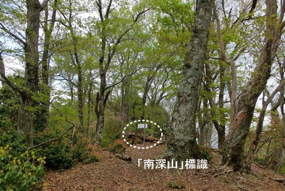 南深山 南深山の東側から自然林を直登してきたので、頂上の少し北側に出てしまった。 |
