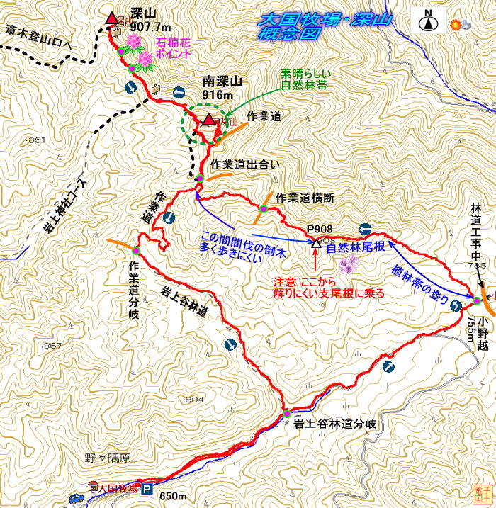 コース:大国牧場(黒尾山林道分岐 )9:14・・小野越9:43・・作業道分岐10:30・・南深山10:51・・石楠花ポイント(撮影タイム)11:01-1:18・・深山11:21(昼食)11:32・・南深山11:48・・作業道・・林道・・大国牧場12:32