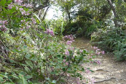 | ロッククライミングのゲレンデから林道を5分程度歩くと三草山への登山口標識があり、ここから山道に入って行きます。道は良く整備されています。 | 秋の花「はぎ」 登山道には秋の七草の一つである「はぎ」が沢山咲いており、ススキと合わせて秋を目からを楽しませてくれます。 |