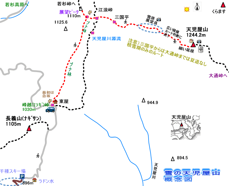 ・・・江浪峠10:26・・三国平10:37・・雪原11:00・・天児屋山11:37-12:25・・三国平13:10・・・江浪峠・・若杉峠方面ピーク・
