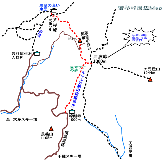 | 今年は梅雨は未だ明けていないのに真夏の様な炎天下の日々が続いています。登山口が標高1000m程度の涼しい山歩きが出来ないかと探してみました。もともと1000m以上の山が少ない兵庫県で登山口が1000m程度の所となると、氷ノ山のスーパー林道沿いの登山口ぐらいしか思いあたらない。そんな都合の良い所は有ると思えなかったのですが、探してみると有りました。 峰越峠から若杉峠までの稜線歩きです。この稜線は全て標高1000m以上でわずかなアップタウンしかなく、展望もよさそうです。ここに決めて夫婦でピストン歩きをしてきました。 峰越峠は兵庫県北西部に位置しており、千種スキー場から延びる舗装道路を約1.5km行くと標高が丁度1000mぐらいの岡山県との県境に有ります。到着した9時過ぎは23℃程度ぐらいで、さすがに涼しい所です。(この日は岡山市内が35℃と今年の最高気温であったと帰宅後のニュースで聞きました。) 前半はほとんどアップダウンのないブナの林の尾根を歩き、後半は見晴らしの良い尾根歩きになります。 日:2008年7月12日 天候:晴れ 同行者:夫婦2名 コース:峰越峠・・江波峠分岐・・・若杉峠・・展望台(昼食)・・若杉峠・・江波峠分岐・・江波峠・・江波峠分岐・・峰越峠 歩行時間:峰越峠・・若杉峠展望台 1時間35分 往復3時間15分 |